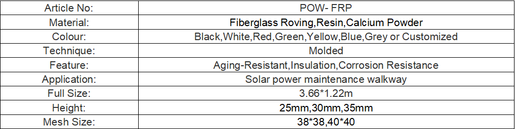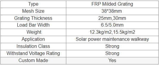 Lorsque des caillebotis FRP sont utilisés comme passerelles solaires pour les toits, les principales spécifications sont les suivantes :